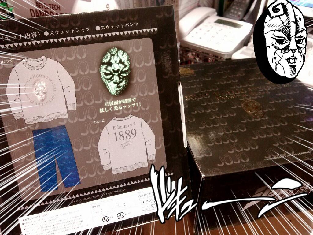 ヴィレッジヴァンガードフリークス 石仮面 のスウェットセットが入荷しました 色は写真に載ってるグレーと 上下ともに黒の2色です 暗いところで石仮面が光りますよー ホラー そんでもって箱が豪華ー サイズはいつも通りsmlでお値段6090円 Http T